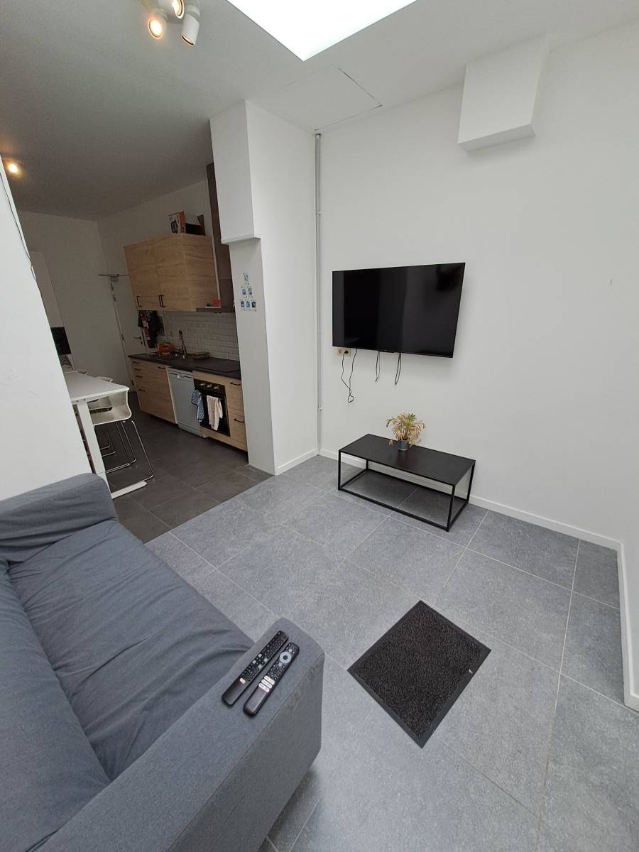 Er is ook een gezellige leefruimte met comfortabele zetel en televisie. Perfect om samen te ontspannen na een lange dag studeren of les volgen.